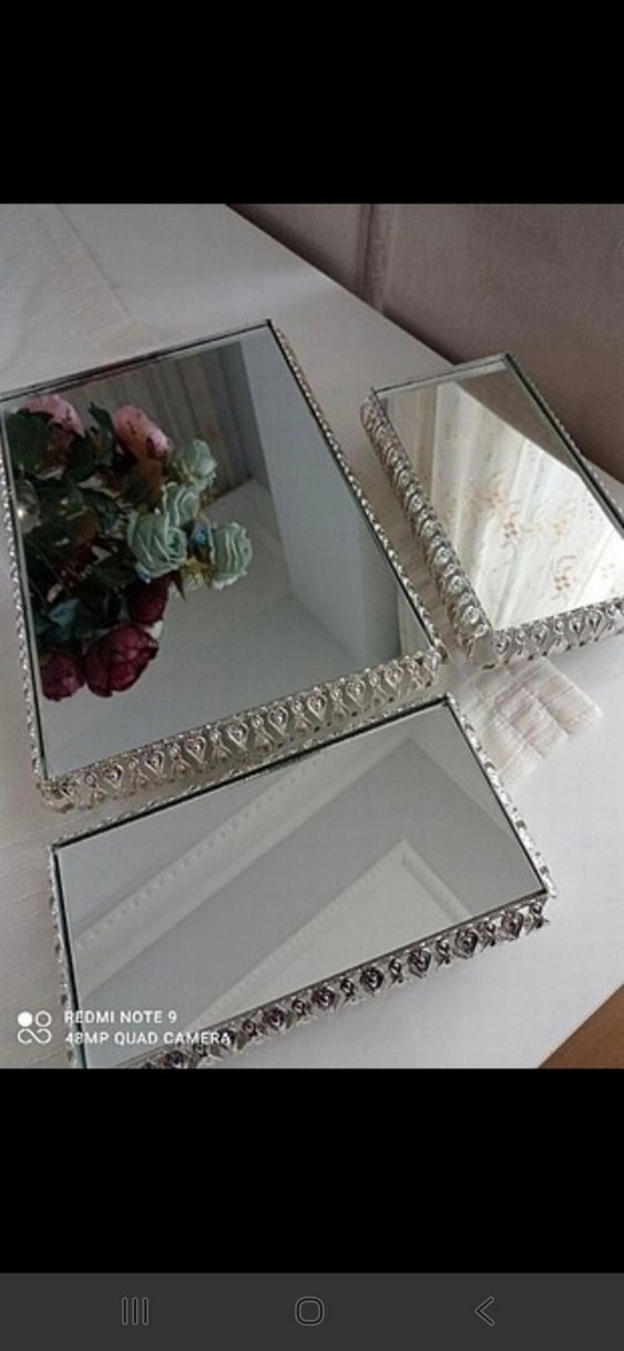 Gümüş süslemeli beyaz dekoratif aynalar seti, iç mekanları şıklaştırmak için uygundur. 3 lü gümüş jardinyer