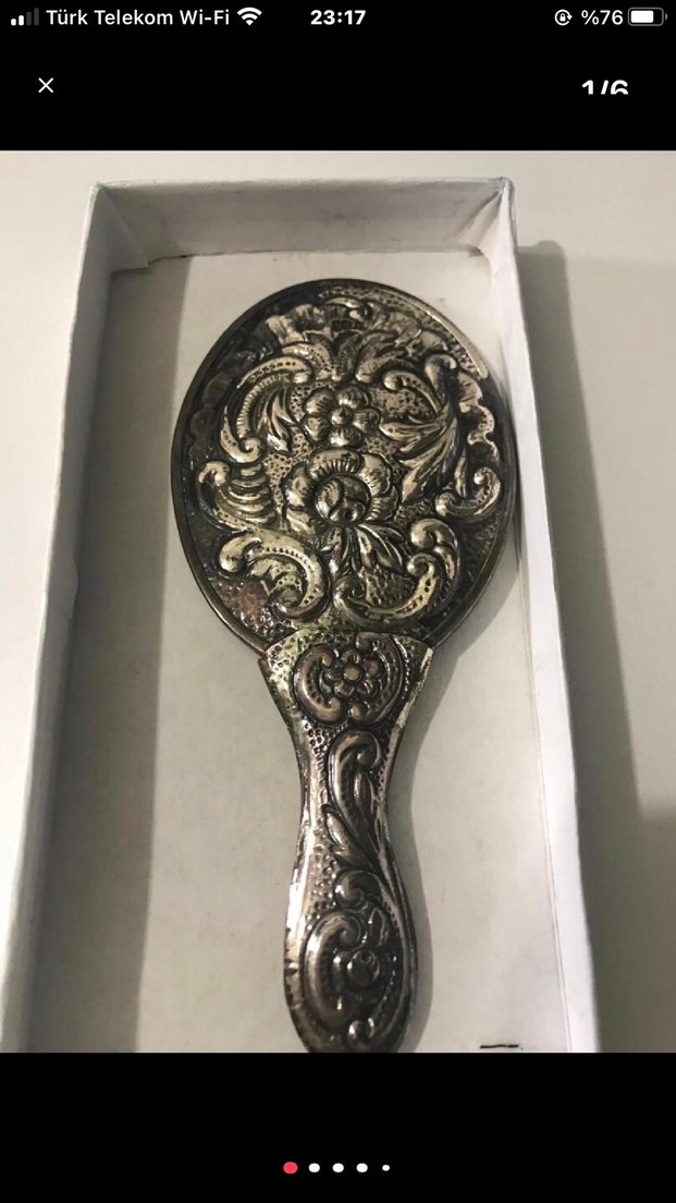 Parlak gümüş renkte ,detaylı çiçek desenli elde taşınan ayna. Hem şık hem kullanışlıdır