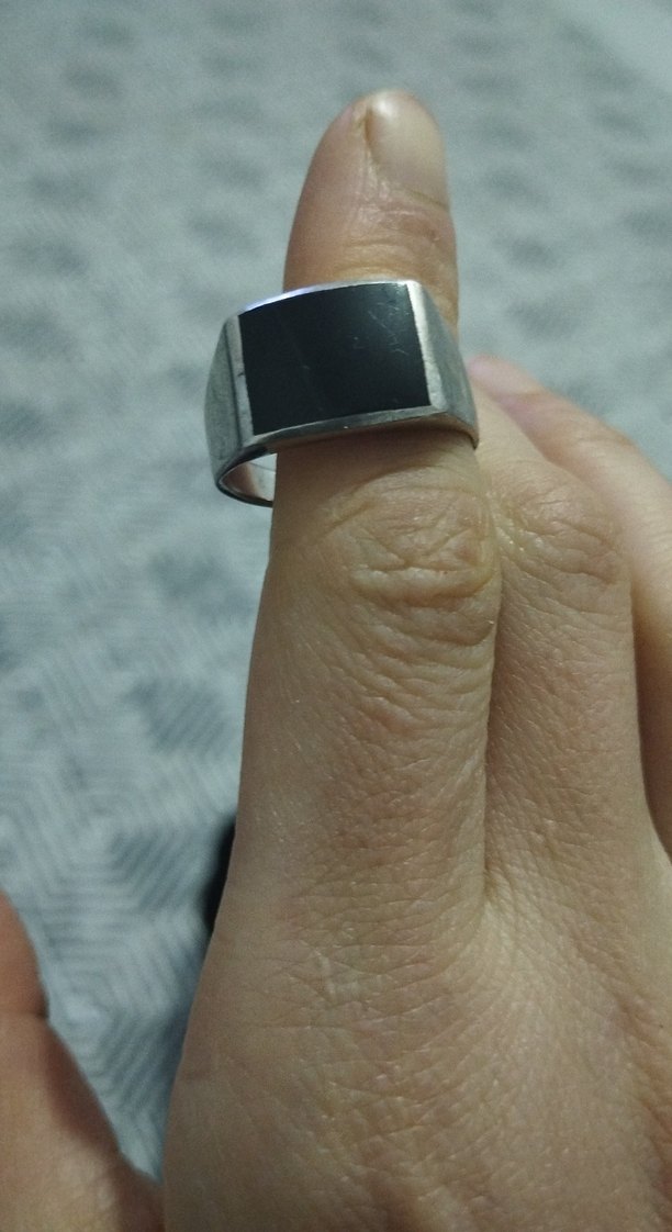Düz ve sade tasarıma sahip, siyah dikdörtgen yüzeyli minimalist erkek yüzüğü. Gri renkli bant ile temel bir stil sunar.