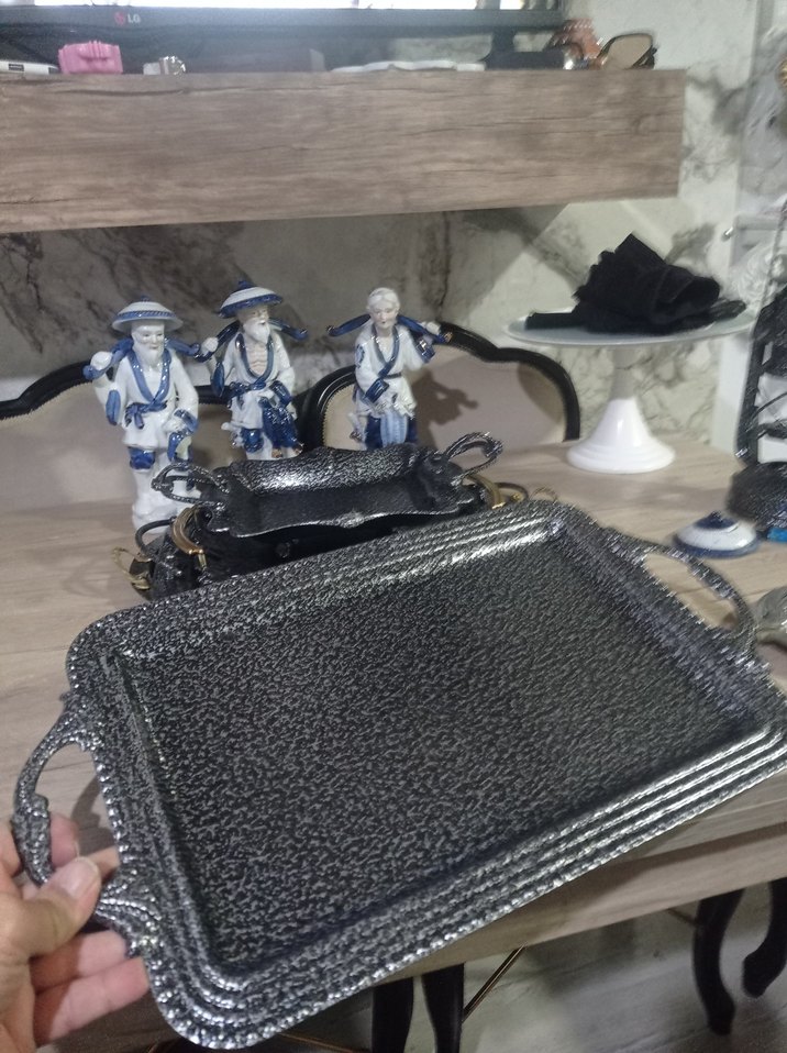 Kulplu, dokulu yüzeye sahip gümüş eskitme metal tepsi seti. Dayanıklı ve kullanışlı mutfak aksesuarı. ️