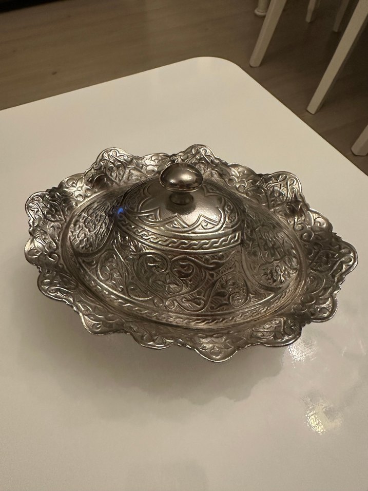 Hiç kullanılmadı, yeni ürün. Alt kısımda görünen etiket kalıntısıdır. 16x12 cm boyutunda. Dekoratif eşya olarak kullanılacağı gibi sunum tabağı olarak da kullanılır. #sunumluk #şekerlik #lokumluk #gümüştabak
