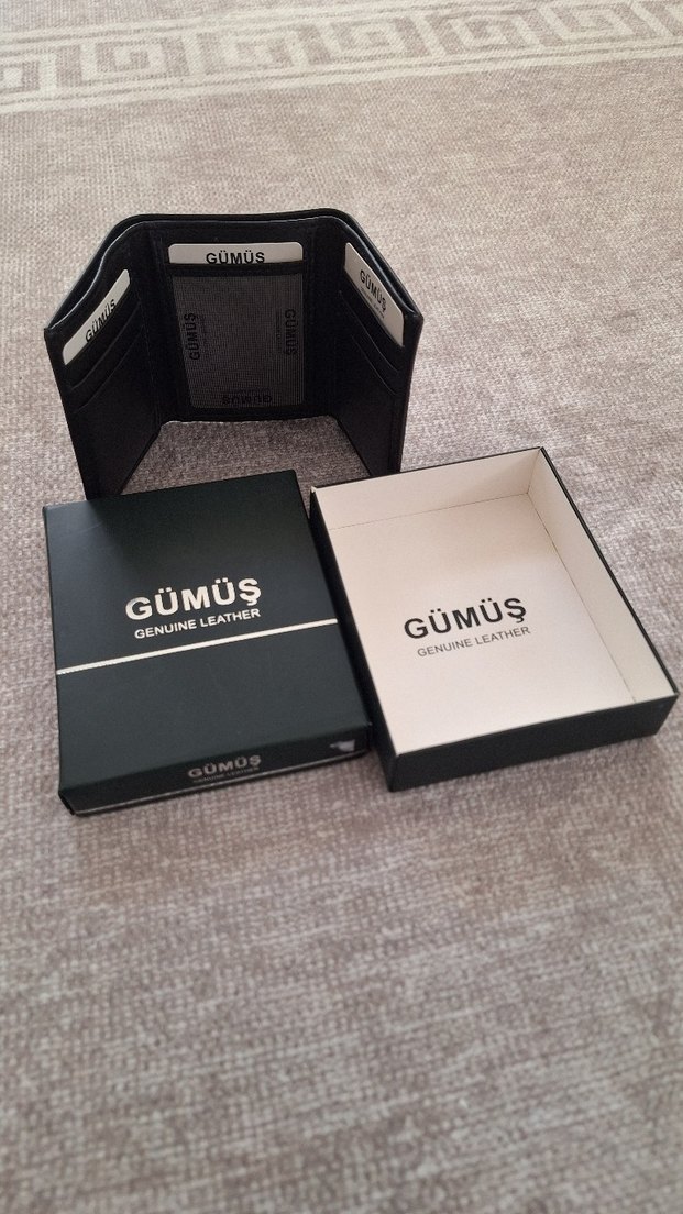 Gümüş markalı, baskılı desenli gri erkek deri cüzdan, altın detaylara sahip, şık ve gündelik kullanıma uygun.