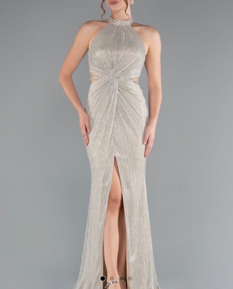 Yüksek yakalı ve askılı, drapeli, gri tonlarında uzun ve vücuda oturan abiye elbise. Bir kez giyildi. Pazaralığa açığım. İade kabul etmiyorum. 165 boyum 60 kilom.
