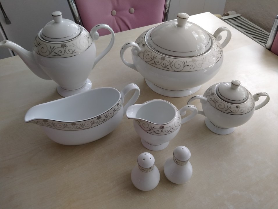 7 parça hiç kullanılmadı sorunsuz Gri desenli beyaz Fin porselen servis takımı, çaydanlık, şekerlik, sürahi, tuzluk, biberlik ve servis kasesi içerir. ️