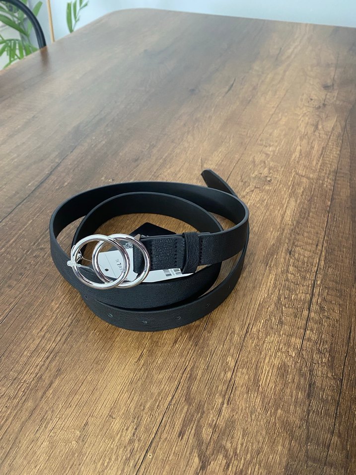 Gümüş çift halka tokalı, siyah deri kadın kemeri, minimalist ve çağdaş tarzı yansıtıyor. Hiç kullanılmadı etiketli ufak bi deformesi var görsel mevcut