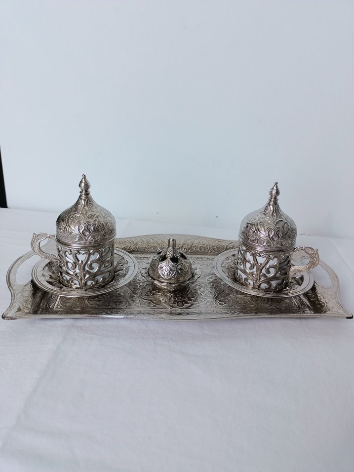 İki kapaklı kahve fincanı, küçük şekerlik ve işlemeli tepsi içeren gümüş detaylı set. ☕