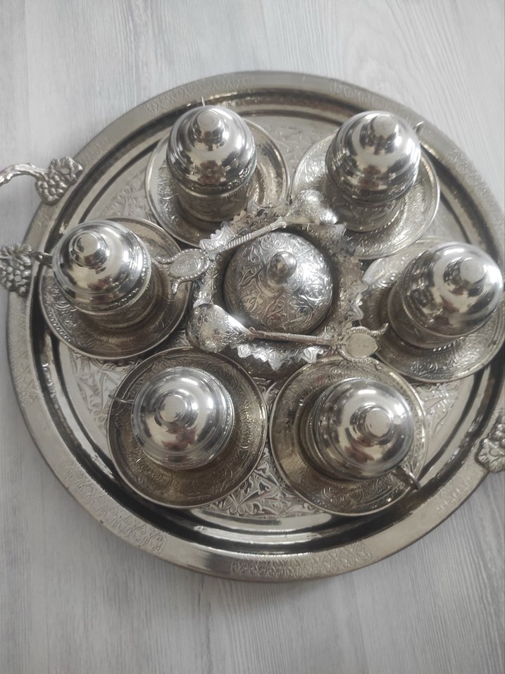 Altı adet kapaklı işlemeli gümüş çay bardağı, tabakları, servis tepsisi ve kaşıkla birlikte şekerlikten oluşan parlak çay seti.
