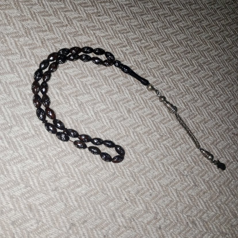 Erkekler için koyu siyah boncuklardan oluşan geleneksel stil tesbih, metal püsküllü zincirle tamamlanmıştır.Ufak tefek Defolar vardir