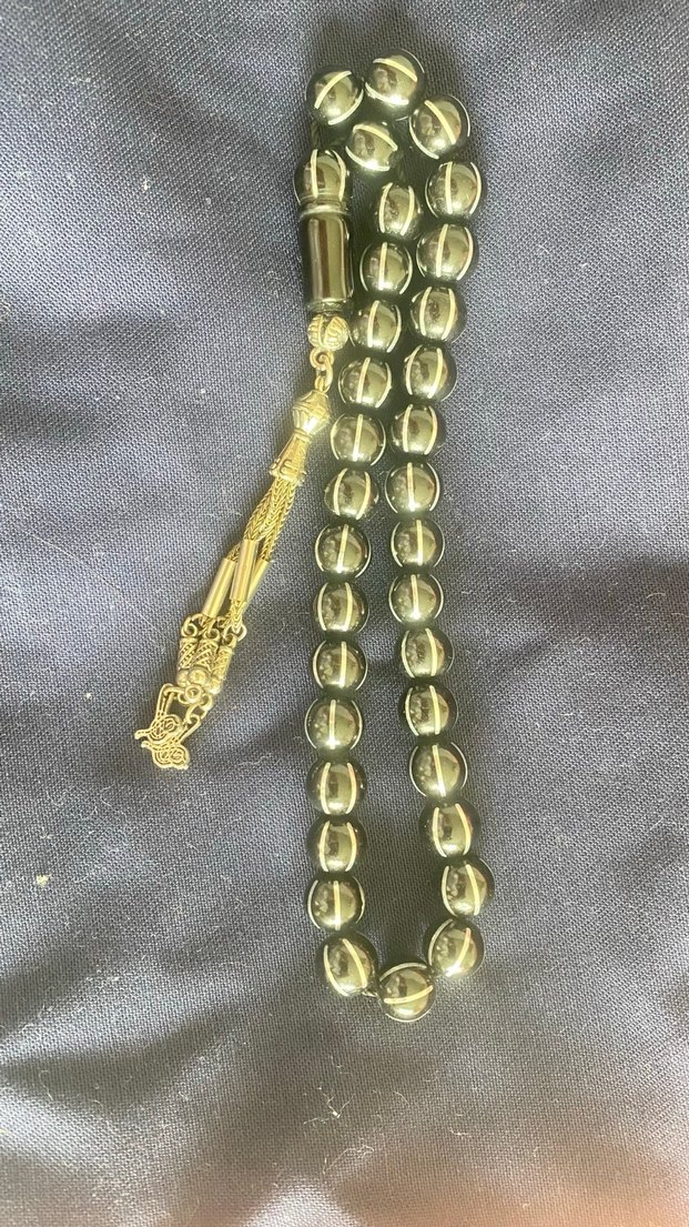 Karpuz dilim yarma gümüş işlemeli alpaka püsküllü püskülün bir ucunda tuğra düşmüş süper bir Oltu tesbih