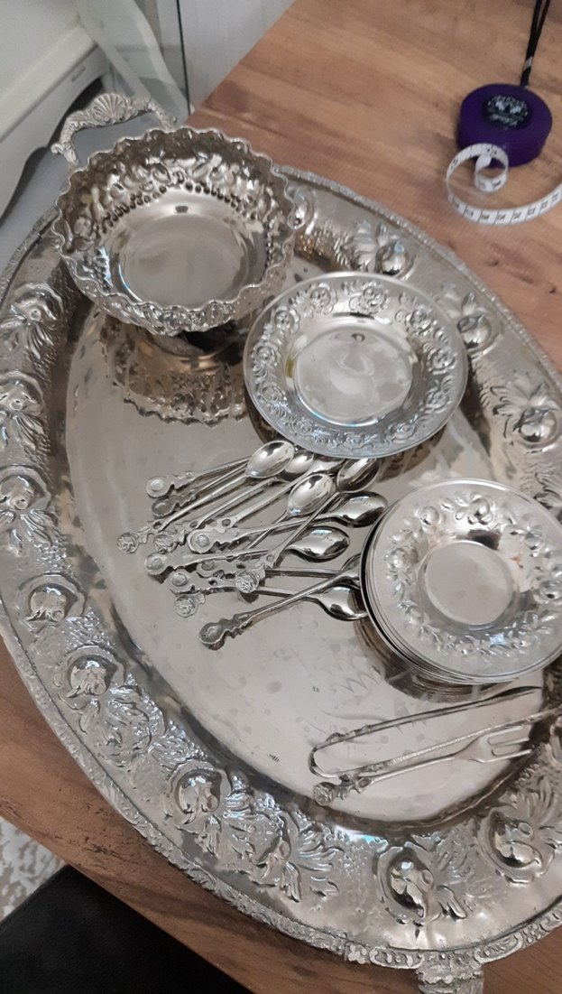 İşlemeli desenlere sahip parlak gümüş tepsi, uyumlu kaşıklar ve dekoratif kase ile servis için uygun. ️12 çay tabağı ve kaşığı.1 adet şekerlik,bir adet limot tabağı ve çatalı ve tepsi