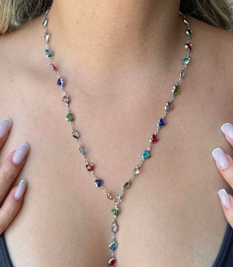 Uzun, çok renkli kalpli taşlı bohem ve retro tarzında, günlük kullanıma uygun kadın kolyesi.