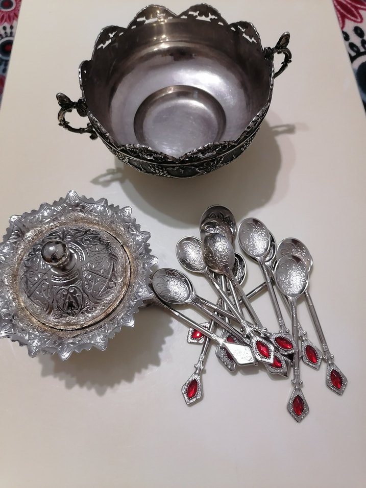 12 adet çay kaşığı, 1 adet şeker kaşığı ve kapaklı şekerlik. Büyük şekerliği de göndereceğim. Sadece vitrinde durdu ve hiç kullanılmadı.