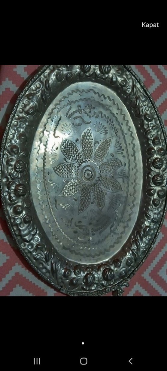 İşlemeli çiçek desenli, süslü kenarlı parlak altın renkli tepsi.