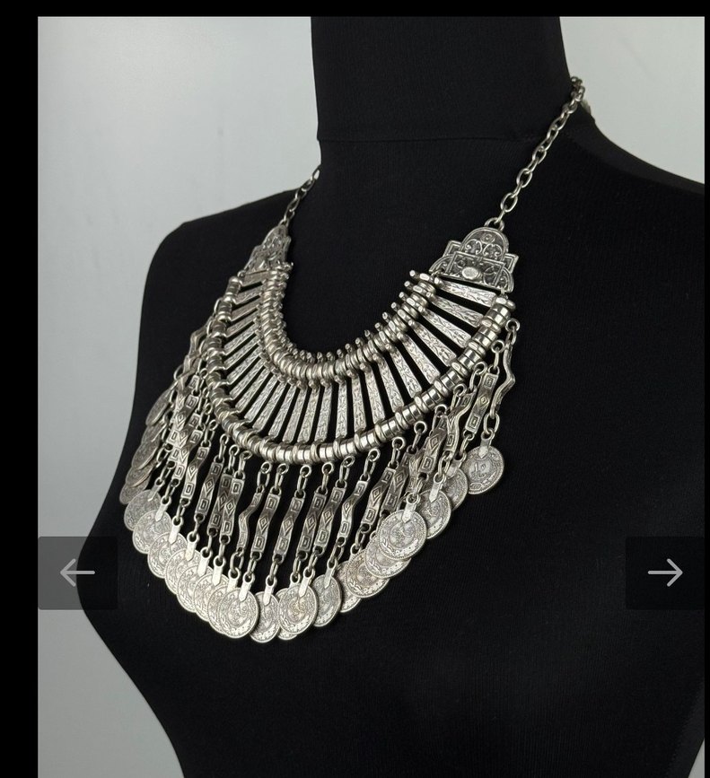 Mat gümüş renkli, bohem tarzda detaylı zincir ve madeni para süslemeli uzun kadın kolyesi, günlük kullanıma uygundur. ✨