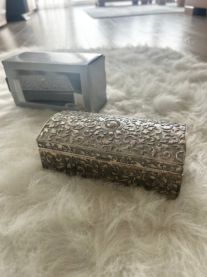 Gümüş kaplama , çiçek desenli kapaklı makyaj düzenleyici kutusu, kozmetikler için şık saklama alanı sunar.