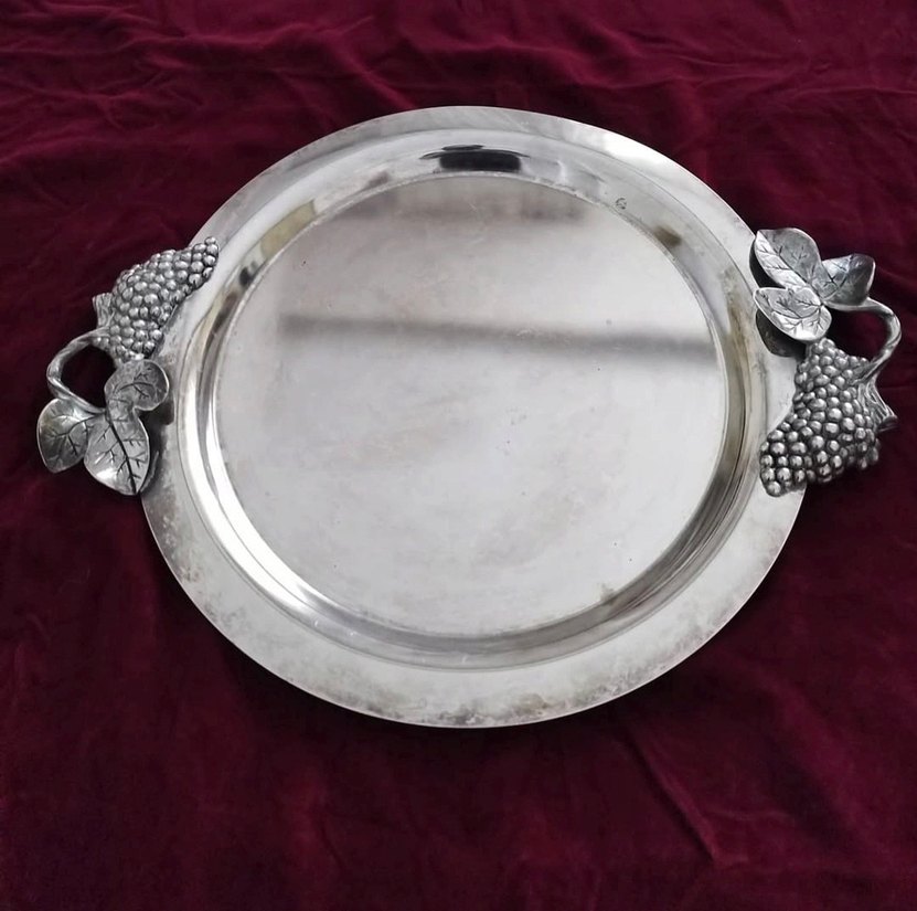 Parlak gümüş renkte, üzüm desenli kulplara sahip servis tepsisi. ölçüleri resimlerdedir