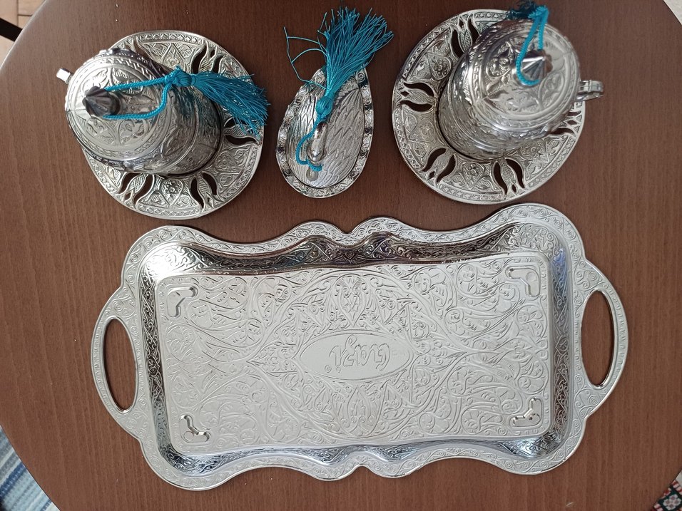 YENİ CIHAN BAKIRCILIK GUMUS KAPLAMALI BAKIR 2'LI KAHVE FINCANI &TEPSI &LOKUMLUK SETİ.☕