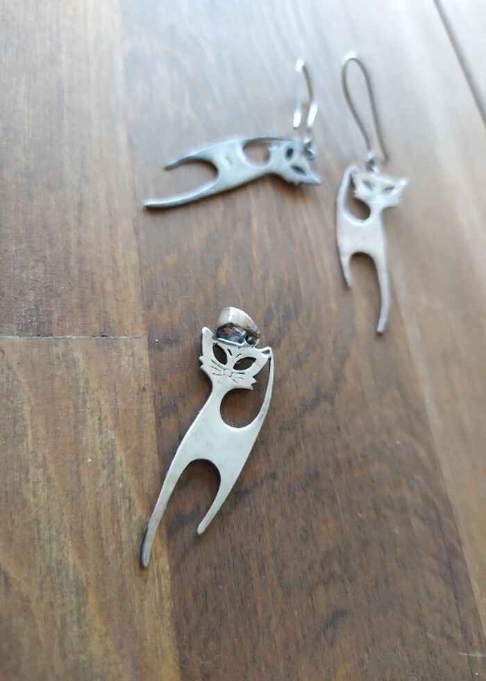 925 ayar gümüş, kedi motifli küpe ve kolye ucu takım