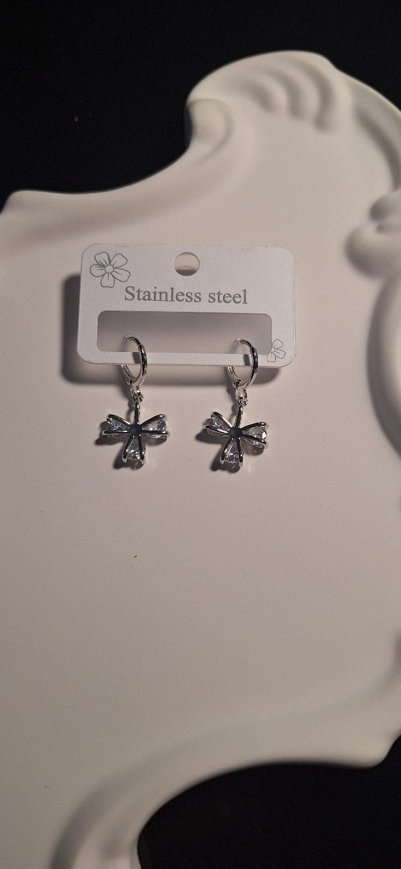 Paslanmaz çelikten yapılmış, kısa uzunlukta ve minimalist fiyonk detaylı günlük kullanıma uygun sokak stili küpeler.