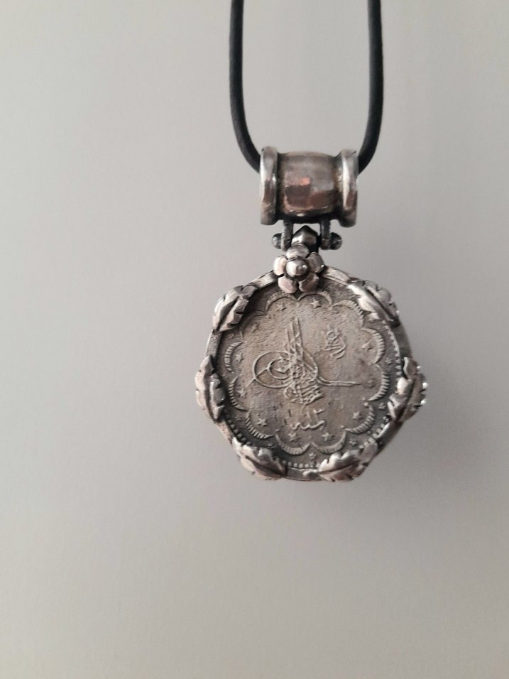 2. Abdülhamid Han dönemi, orijinal gümüş Osmanlı parası , 1 cm kalınlığında gümüş çerçeve içindedir. Çerçeve çevresi çiçek ve yaprak motiflidir. Çok şık bir kolye dir. Çerçeve paraya zarar vermeyecek şekilde monte dir. Paranın koleksiyon değeri vardır. Ayrıca kolye olarak nadir ve tasarım bir modeldir. Yaklaşık 40 yıl önce alındı. Kolye Çapı 2 cm.dir. 1 Tl den büyüktür. Asma yeri ile 3 cm dir. Kadın ve Erkek kullanabilir Unisekstir. Fiyat kuyumcu değerlendirmesine uygun konuldu