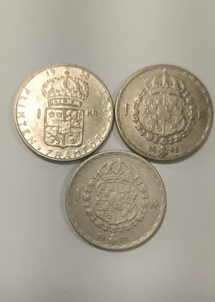 Güzel Kondüsyonda 3 adet 1943, 1950, 1958 tarihli İsveç 1 Kron Gümüş