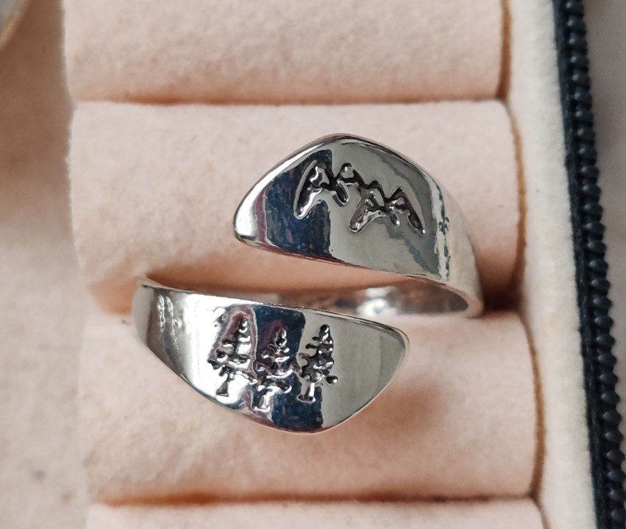 Gümüş parlak renkte, manzara desenli detaylara sahip kadın yüzüğü, rahat ve biker stilini dış mekan için birleştiriyor. Hiç kullanılmadı.