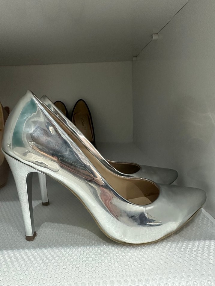 Gümüş parlak metal topuklu kadın stiletto, şık ve çağdaş tasarıma sahip, ofis kullanımına uygun. ✨
