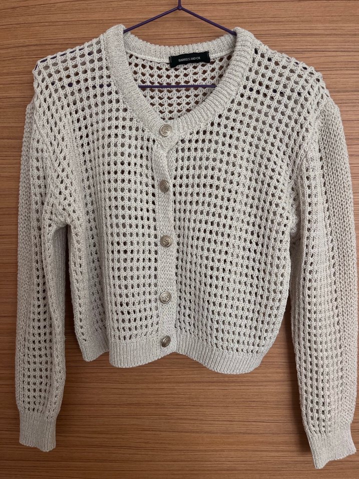 Beyaz renkli, uzun kollu ve yuvarlak yakalı örgü kadın hırka. Rahat kesimi ve midi boyu günlük kullanıma uygundur. İçinde gümüş parlaklıklar var
