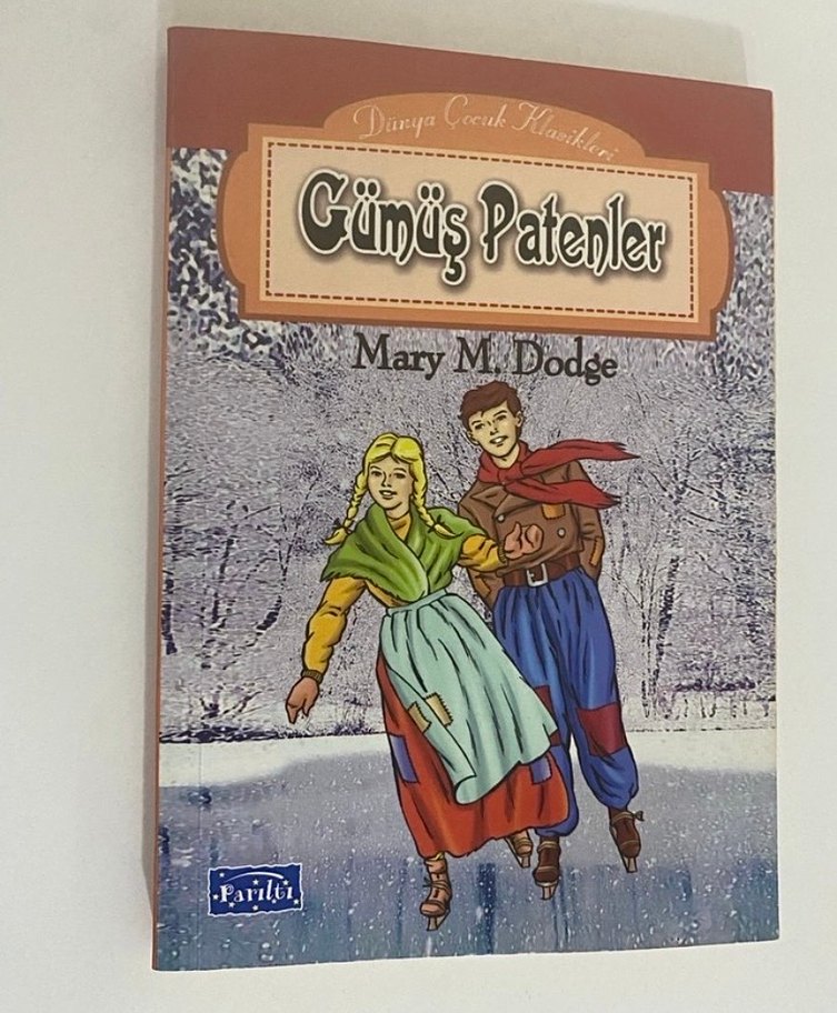 Mary M. Dodge tarafından yazılan "Gümüş Patenler" çocuk kitabı, kapağında buz pateni yapan iki çocuk ve kış manzarası yer alıyor. ❄️