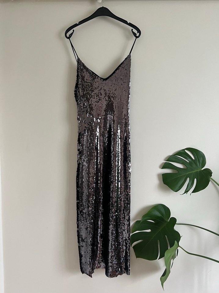 Askılı, payetli, astarı mevcut. Midi boy✨Hiç kullanılmamıştır.