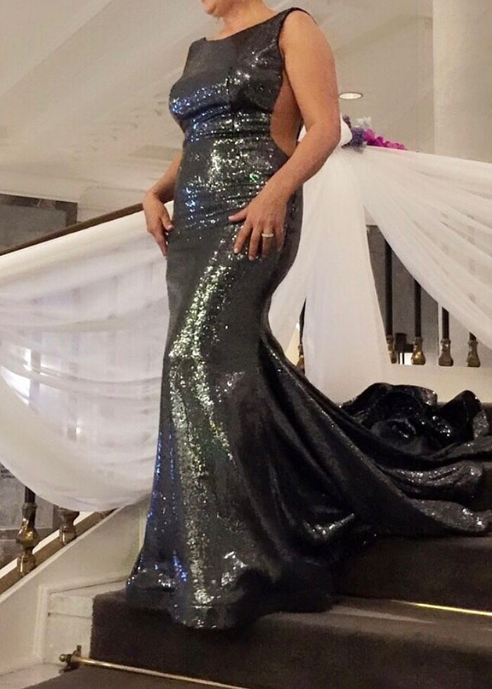Gümüş rengi pul paletli sırtı V balık model uzun kuyruklu abiye elbise. 1 kere giyildi..