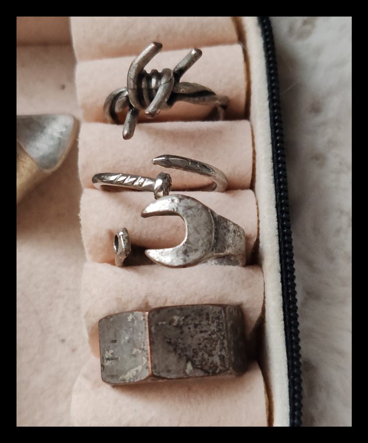 Gümüş renkte, kayış detaylı ve grunge punk tarzını yansıtan dört adet kadın yüzük seti, çivi, tel, su anahtarı ve somon model. günlük kullanıma uygun rock punk havasında. Çivi hariç hepsi antik gümüş. Somom biraz yıpranmış.