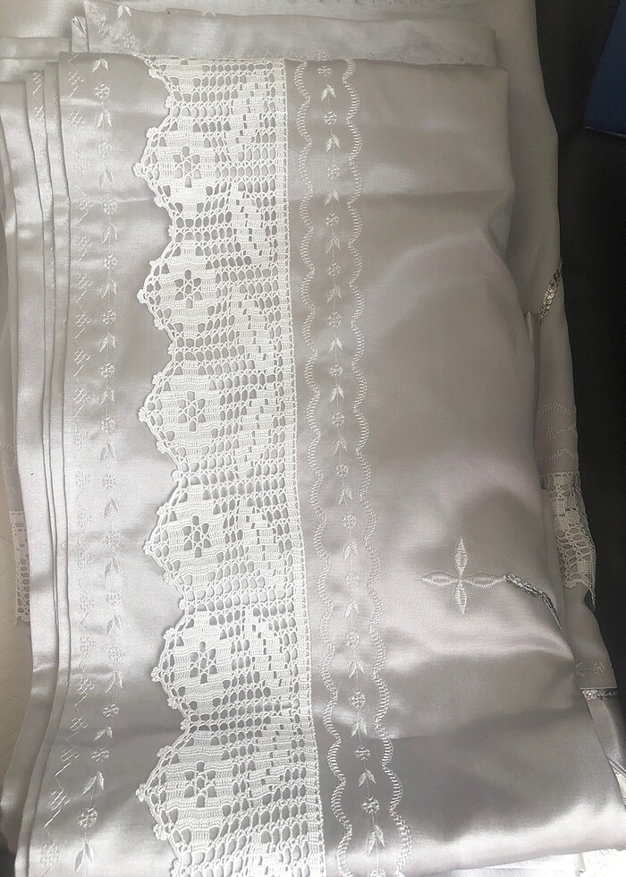 Gümüş rengi gerçek dantel ile sarılmış pike takımı