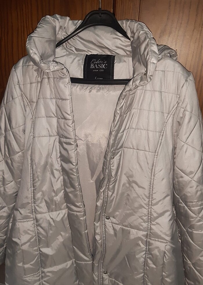 gümüş rengi uzun şişme mont