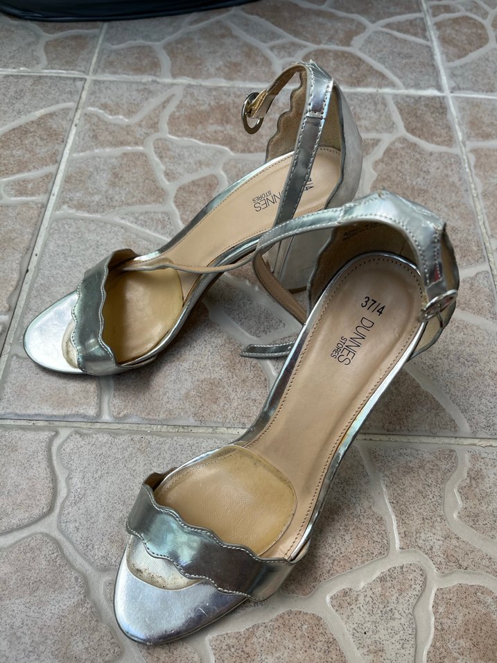 Gümüş rengi topuklu kadın ayakkabısı. Tokalı bilek kayışı ile şık ve modern bir tasarım.