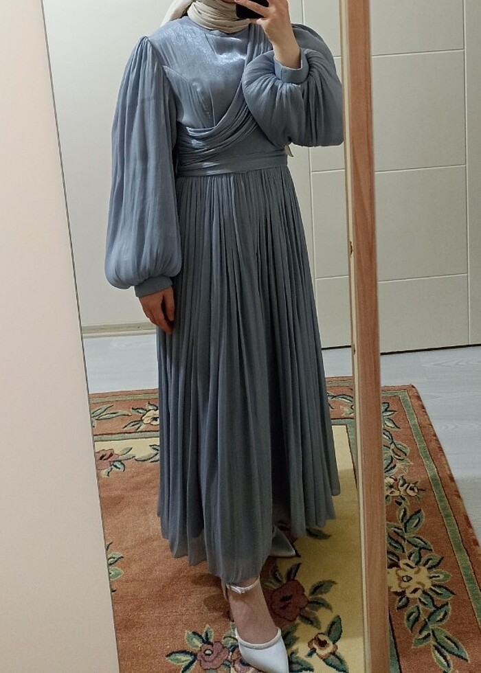 Yeni aldım ama hiç giymedim etiketi yok ama ürün sıfırdır. Boyum 150cm fotoğrafta göründüğü gibi bilekte bitiyor elbisenin boyu