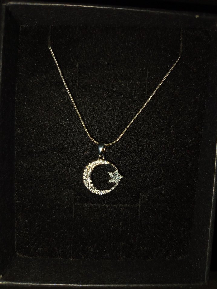Uzun zincirli gümüş renkli kolye, ay ve yıldız figürlü sade gotik tarzı yansıtır.