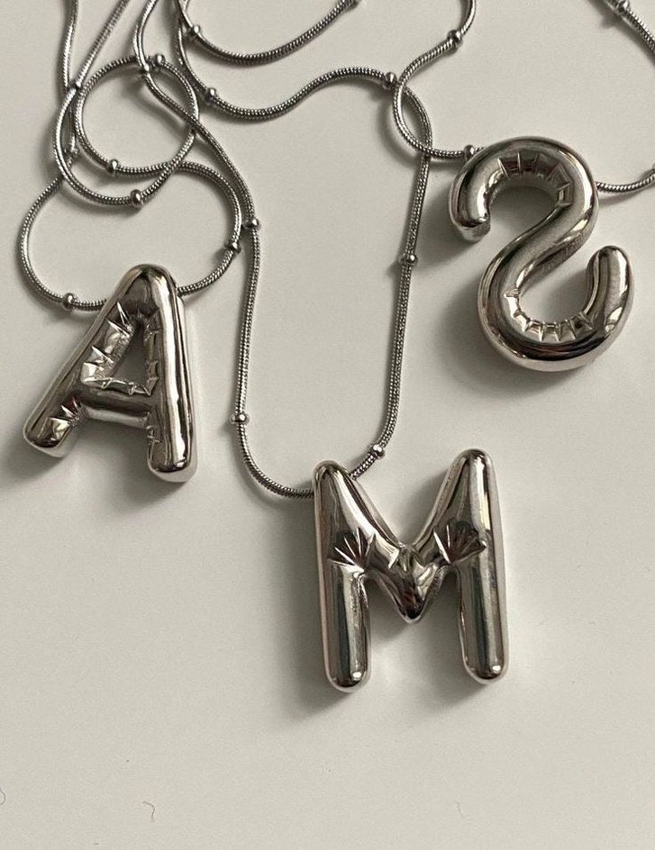 Gri zincir detaylı, harflerden oluşan minimalist ve çağdaş tasarım kolye. ✨ görsel temsilidir.