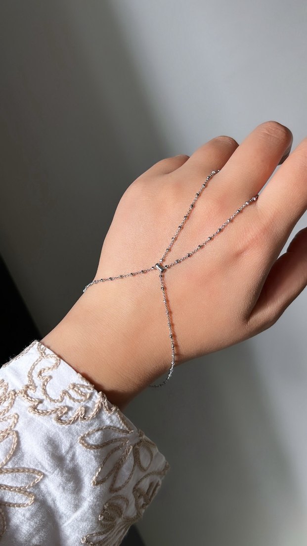 Bej renginde, zincir detaylı minimal tasarımlı kadın el zinciri, günlük kullanıma uygun bohem tarzda.