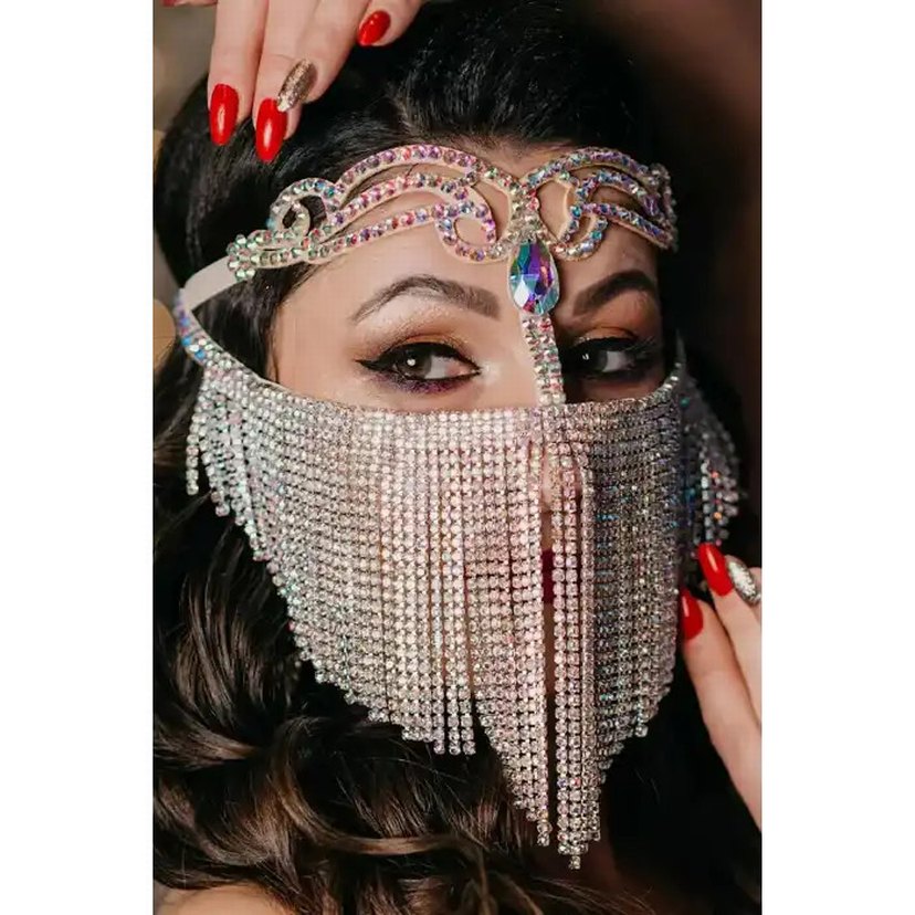 Parlak metalden yapılmış, çok renkli taşlarla süslenmiş ve püsküllü yapıya sahip yüz maskesi, bohem ve retro tarzlar için uygundur. ✨