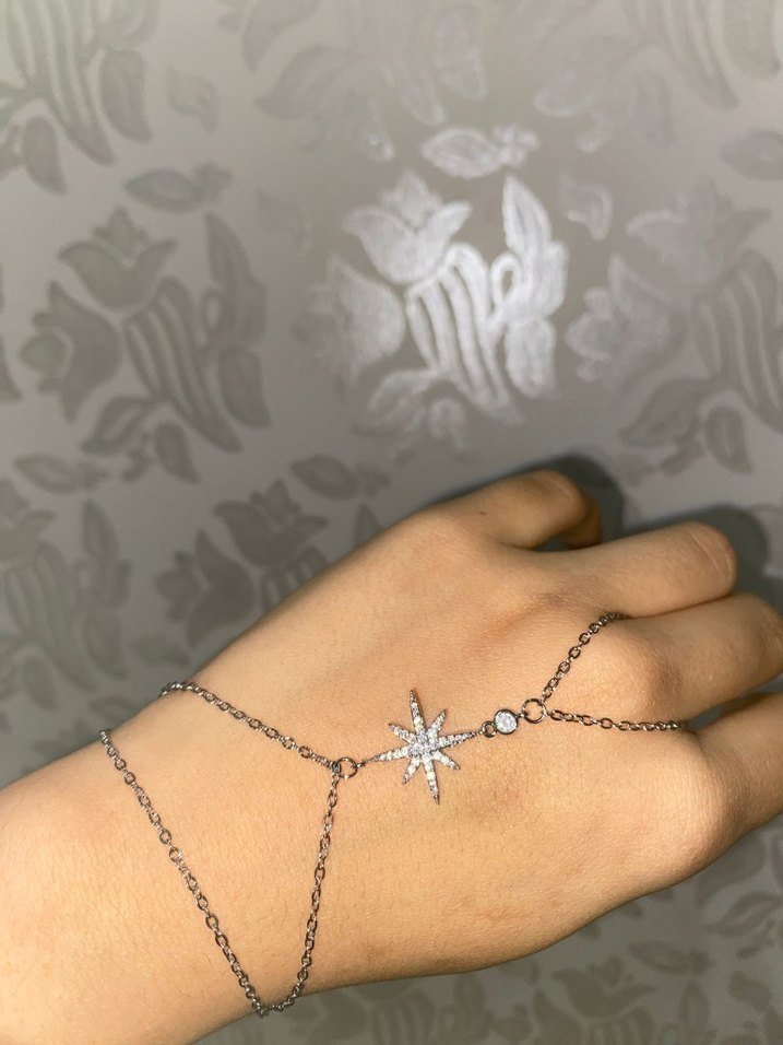 Bej renkte, zincir detaylı ve yıldız figürlü bohem tarzda kadın el zinciridir. Minimalist ve günlük kullanıma uygun hafif nakışlı tasarıma sahiptir. ✨