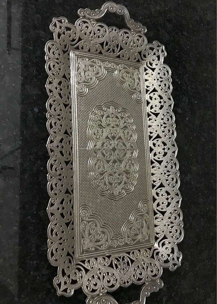 Gümüş renk Nişan kahve tepsisi ürünü sadece istememde kullandım başkada kullanılmadı,ölçüleri en iç 12 cm,boy iç 26 cm,en dış boy 40 cm,boy dış 20 cm.