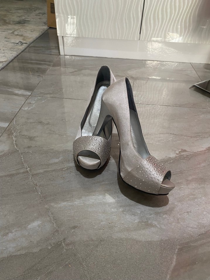 Gri renkte, payetli ve üstü taşlı platform topuklu kadın abiye ayakkabısı. Kauçuk malzemeden üretilmiştir, düğün ve özel günler için uygundur. Temiz ihtiyaç fazlası ürün