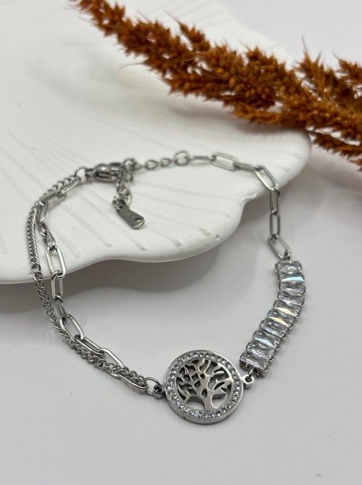 Gümüş renkli zincir detaylı, yaşam ağacı figürlü ve taşlı kadın çelik bileklik. Minimalist bohem tarzda, günlük kullanıma uygun. Kararma yapmaz