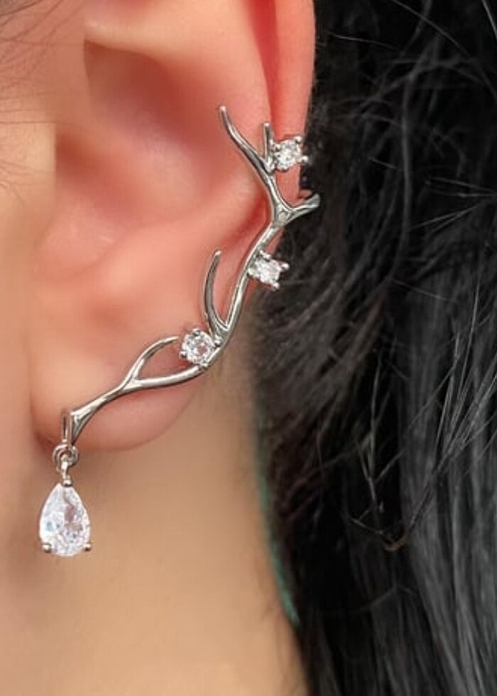 Gümüş Renk Taşlı Dal Desenli Kulak Aksesuarı (Çelik)