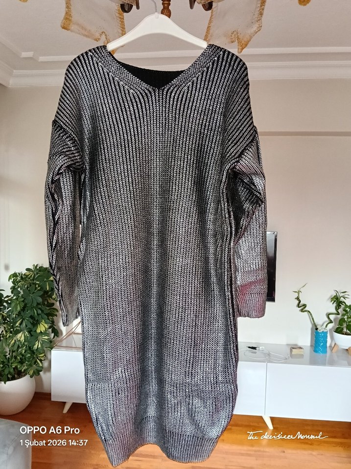Gri renkli, V yakalı ve uzun kollu örgü kadın kazak. Salaş kesimiyle rahat ve şık bir görünüm sunar.