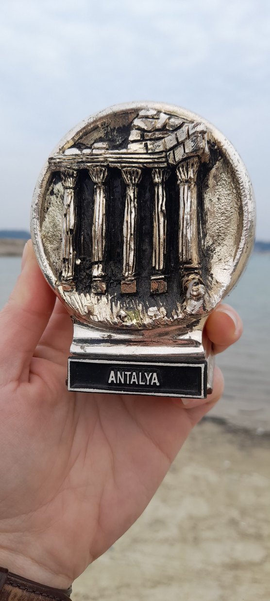 Gumuş renklerde, Antalya'nın antik sütunlarını detaylı işleyen ve tabanında "ANTALYA" yazan biblo.