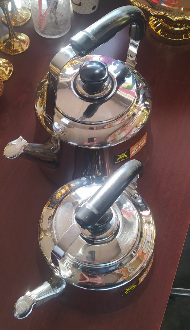İki adet siyah saplı, gümüş renkte çelik çaydanlık seti, çay demlemek için uygundur.