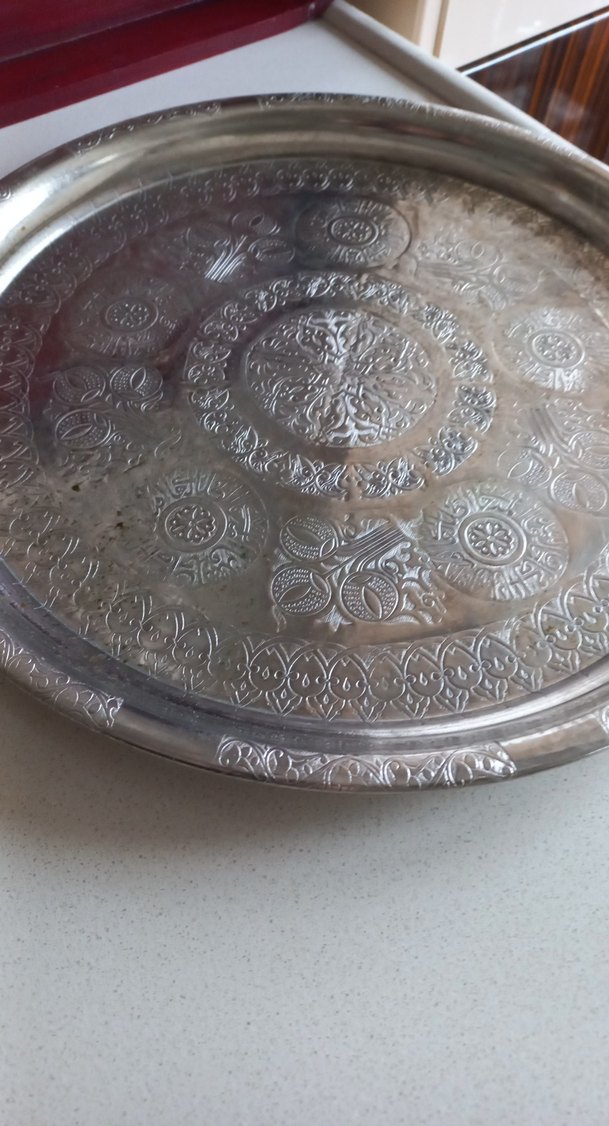 Parlak gri renkte, desenli detaylara sahip yuvarlak tepsi, klasik bir dokunuş katıyor.