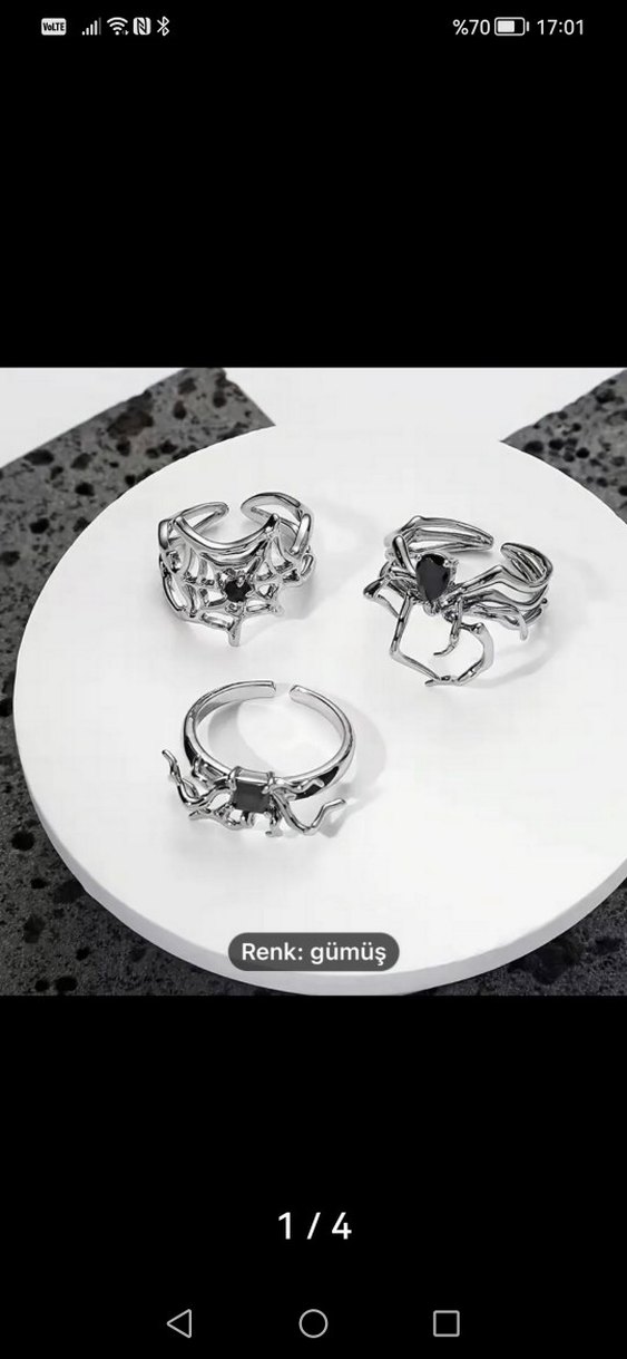 Gümüş renkli, örümcek desenli gotik yüzükler. İşlemeli detaylarıyla romantik akşamlar için şık ve trend.